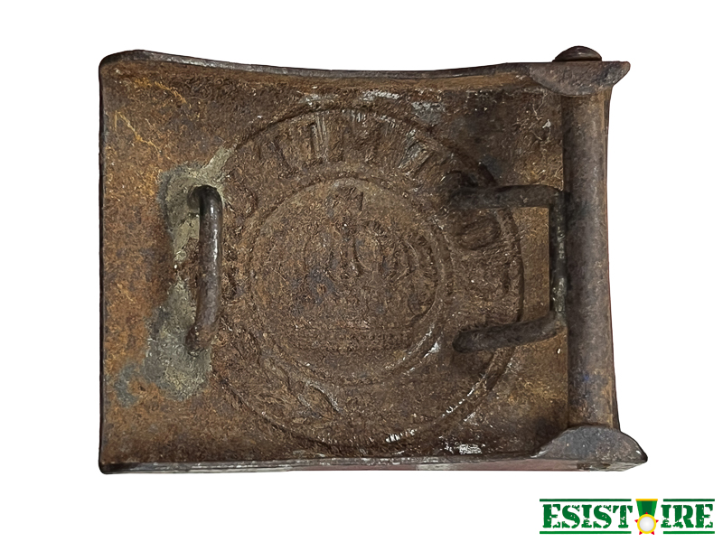 La finition gris mat (feldgrau) correspond aux fabrications de guerre, lorsque les modèles en laiton poli d’avant 1914 ont progressivement été remplacés par des boucles en acier peint pour des raisons d’économie.