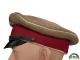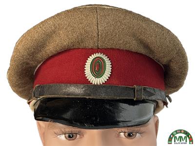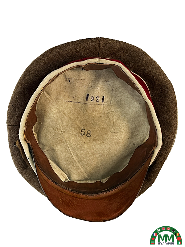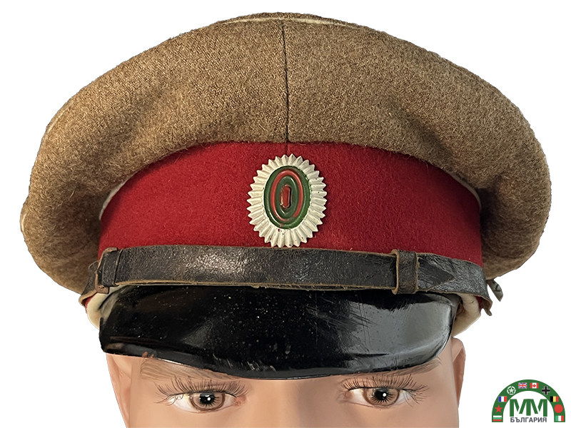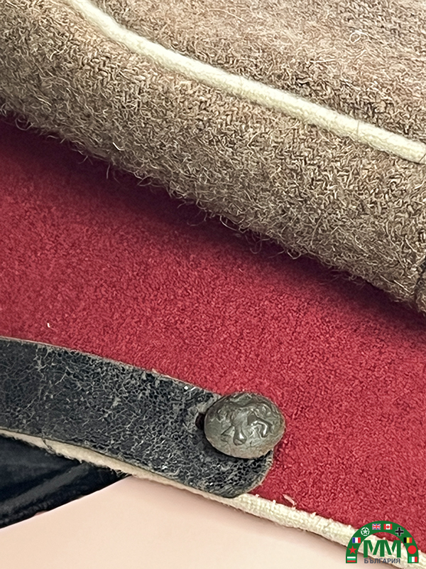 Casquette d’officier bulgare de la cavalerie, modèle 1910/1915, composée d’une bombe en drap brun-olive, d’un large bandeau frontal en drap rouge et d’un passepoil blanc soulignant les contours supérieurs et inférieurs. La visière est en fibre laquée noire et la jugulaire, en cuir noir, est maintenue par deux petits boutons métalliques représentant le lion héraldique couronné du royaume de Bulgarie.