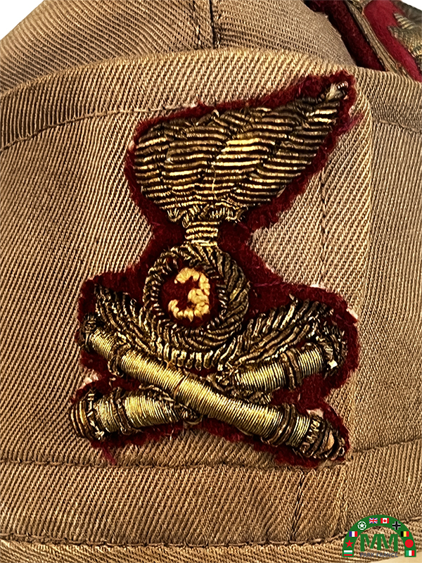 Insigne frontal : Artiglieria (artillerie de campagne ) Canons croisés surmontés d’une bombetta Chiffre “3” brodé du 3° Reggimento Artiglieria “Pistoia” unité historiquement engagée en Afrique / Libye