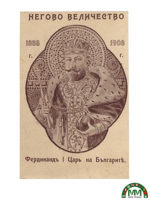 Carte postale illustrée représentant Ferdinand Ier, souverain de Bulgarie, en tenue d’apparat et avec regalia (couronne, sceptre, manteau royal). L’image est encadrée par un motif décoratif de type mosaïque. Les dates 1885 et 1908 évoquent deux étapes majeures de l’histoire bulgare sous son règne :