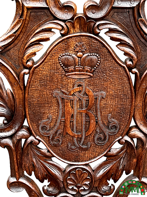 Contexte historique. Alexandre de Battenberg (1857–1893) fut le premier prince (kniaz) de Bulgarie après la libération du pays du joug ottoman, élu en 1879. Bien que son règne soit relativement court, il entretint des liens étroits avec les cours européennes, notamment austro-hongroise et germaniques, ce qui explique la provenance probable des ateliers ou de la commande. Les éléments décoratifs et la qualité d’exécution suggèrent une production destinée à une maison princière ou à un décor officiel, témoignant du rayonnement culturel et diplomatique de l’époque. État de conservation. L’ensemble est en excellent état de conservation, avec une patine homogène du bois et des éléments incrustés. Les sculptures et gravures restent très lisibles, et le monogramme princier est exempt de restaurations altérant son intégrité visuelle.
