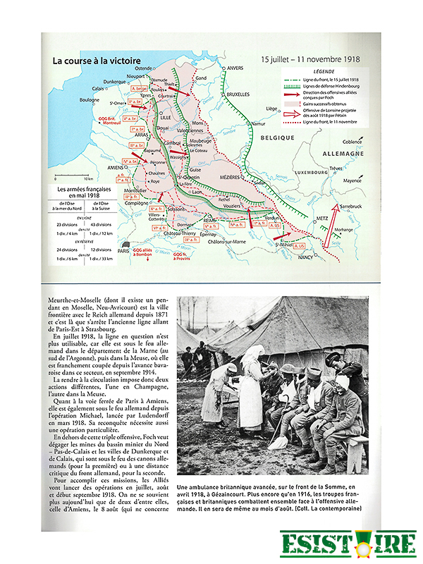 Après l’échec allemand du Friedensturm, en Champagne, le 15 juillet 1918, les Français contre-attaquent le 18 juillet contre le saillant formé par les Allemands dans l’Aisne et la Marne. Le 8 août, c’est au tour des Britanniques et des Français d’attaquer devant Amiens et de provoquer un effondrement de la première ligne allemande qui surprend tout le monde, à commencer par Ludendorff lui-même. Le front n’est pourtant pas rompu et l’avance alliée piétine. Foch, le général en chef des armées alliées, prépare alors une offensive généralisée qui débute à la fin du mois de septembre et remporte des succès sans précédent sur le front britannique, tandis qu’à l’est, Français et Américains progressent nettement moins. L’avance anglaise produit un repli généralisé des troupes allemandes et, dès le 6 octobre, les Allemands proposent d’entamer des pourparlers pour un armistice. À partir du 15 octobre, les offensives alliées redoublent d’intensité. Nulle part les Allemands ne sont en mesure de s’opposer à la pression alliée et ils finissent par accepter un armistice aux clauses très dures parce que la révolution a éclaté en Allemagne et que seule l’armée peut être en mesure de rétablir l’ordre et d’éviter une révolution de type bolchevik.