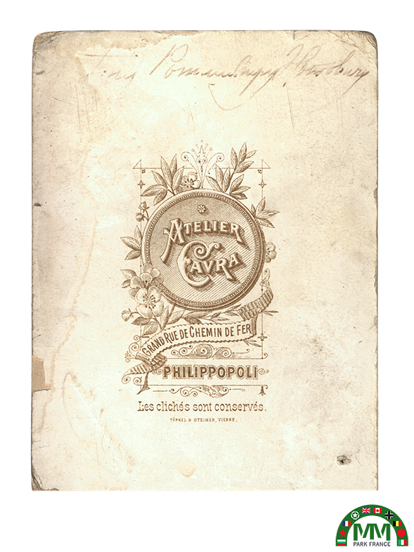 Photographie sépia en pied d’un militaire de la Garde royale bulgare en grande tenue à brandebourgs. Tirage de studio sur carton, vers 1890. Signature/annotation manuscrite sur l’image, usures du support.
