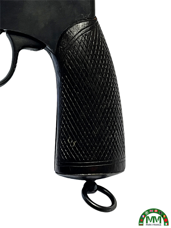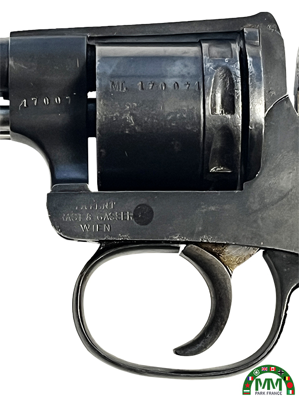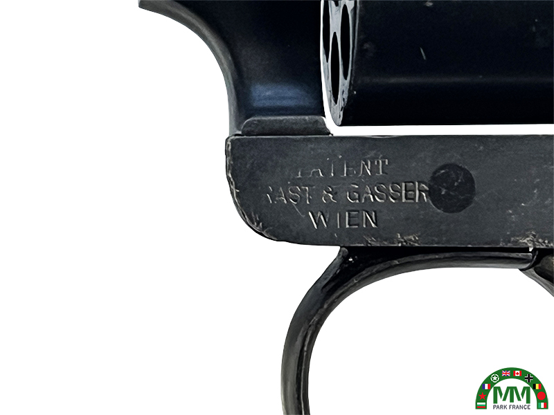 Revolver militaire autrichien à carcasse massive, doté d’un barillet fixe à huit chambres et d’une tige d’éjection latérale. La carcasse porte le marquage du fabricant « Rast & Gasser – Wien ». La poignée est munie d’un anneau de dragonne, caractéristique des armes réglementaires.