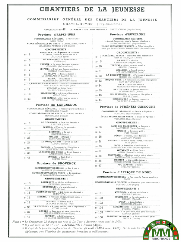 L'armistice du 22 juin 1940 ayant supprimé le service militaire obligatoire, les chantiers de jeunesse sont créés à la place, le 30 juillet 19401. Les jeunes hommes de la zone libre et de l'Afrique du nord française en âge d'accomplir leurs obligations militaires y sont incorporés pour un stage de six mois. Ils vivent en camp près de la nature, à la manière des scouts à la différence importante qu'ils ne sont pas volontaires et ils accomplissent des travaux d'intérêt général, notamment forestiers, dans une ambiance militaire. Ils sont encadrés par des officiers et des sous-officiers d'active et de réserve démobilisés, ainsi que par des aspirants formés pendant la guerre de 1939-1940. À partir de 1941, l'obligation des chantiers de jeunesse est étendue à tous les Français de zone libre devant accomplir leurs obligations militaires pour 8 mois.