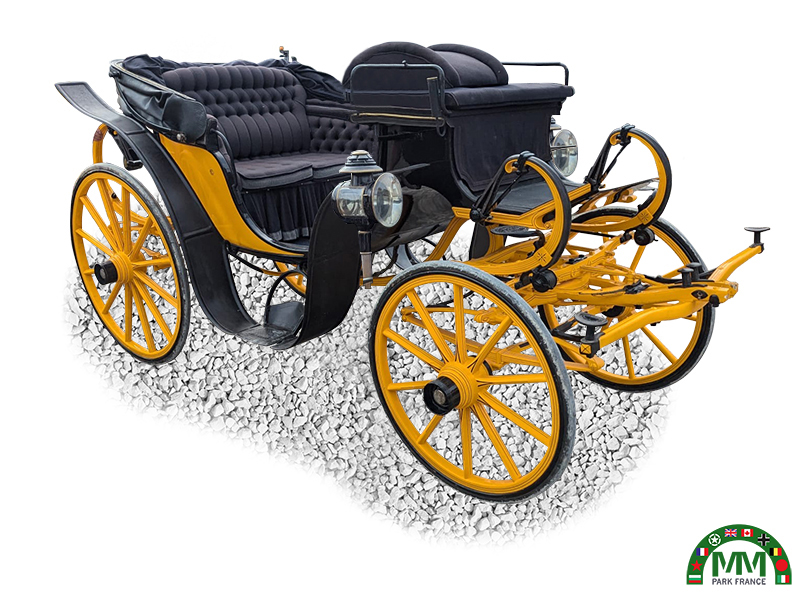 Calèche type Victoria à 2 chevaux, 8 ressorts et 4 roues caoutchoutées.