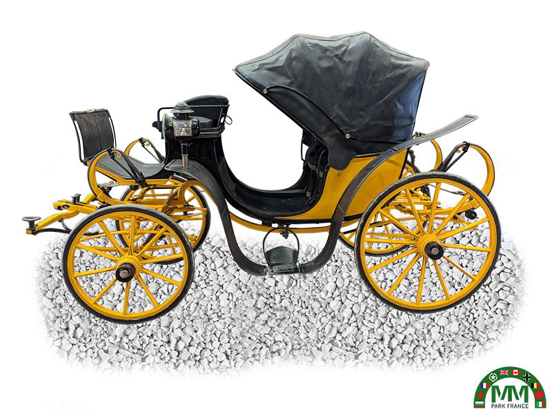 Volée fixe, trains reliés à flèche à col de cygne. Capote en cuir, garniture intérieure en drap bleu nuit, garde-crotte en cuir, ailes en cuir.